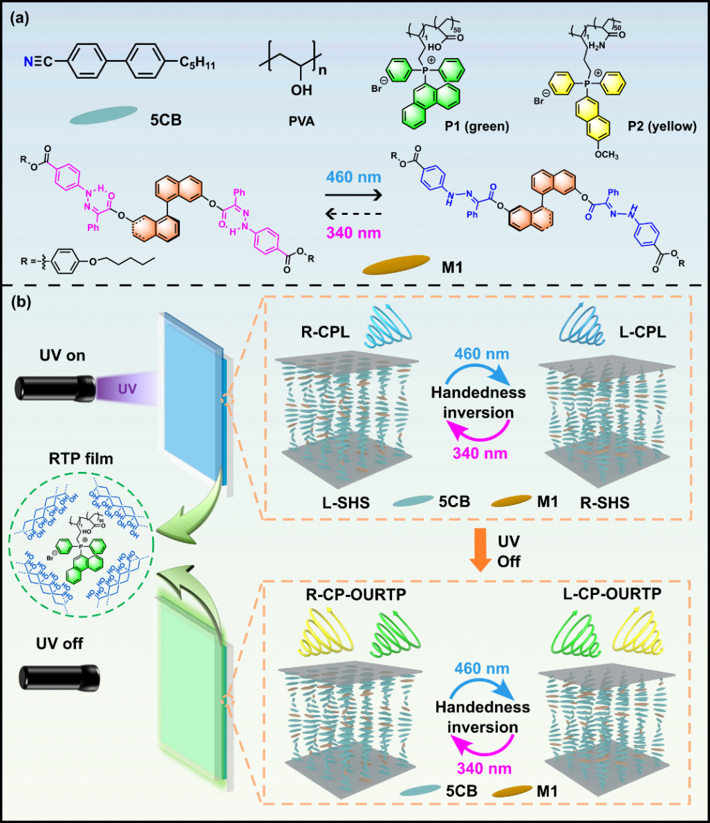 1.双层圆偏振有机超长室温磷光(CP-OURTP)薄膜中实现手性翻转动态调控的分子结构和示意图。(a)所需材料的分子结构(b)双层CP-OURTP薄膜动态手性翻转示意图。