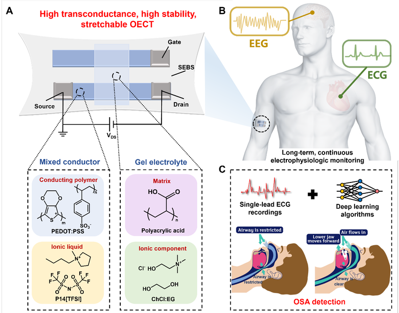 1. 用于长期电生理监测和OSA检测的高性能、可拉伸和高稳定性OECT