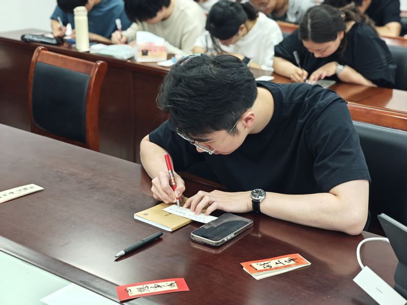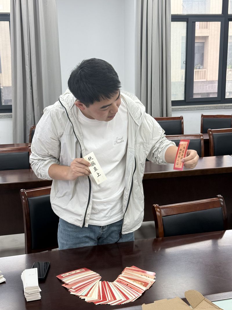 在这个充满希望与温情的日子里,电光学科楼内一场意义特别的活动悄然开展。南京邮电大学电光柔学院本科生第二党支部全体党员与辅导员老师们5月8日齐聚一堂,用手中的笔、心中的情,为即将踏上考研征程的同学们书写祈福书签,传递温暖与力量。