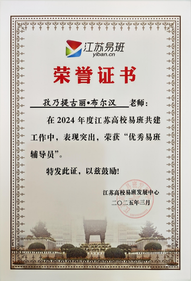 近日,2024年度江苏高校易班共建工作评优结果公布。我平台 辅导员孜乃提古丽·布尔汉获得江苏省“优秀易班辅导员”荣誉称号,全省仅10名辅导员入选。