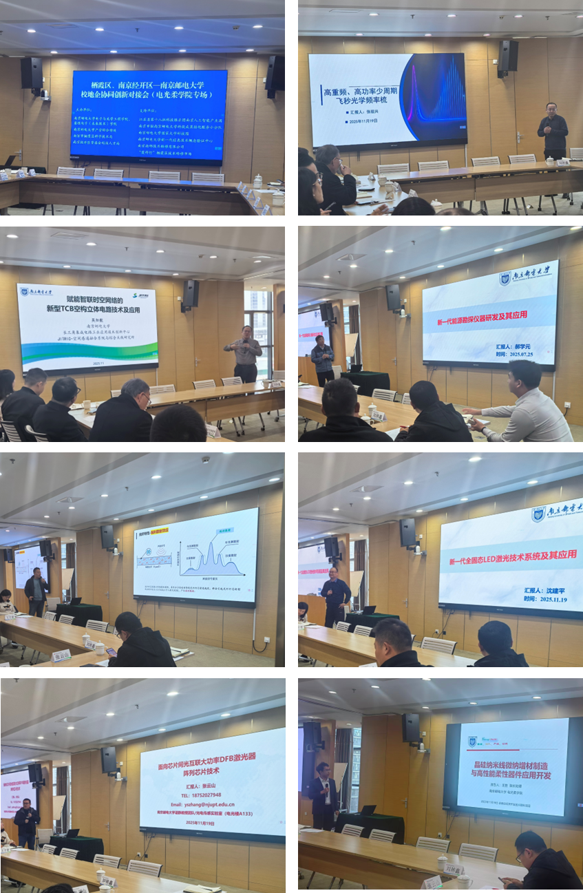 会上,学院教授团队集中发布了一批具有高转化价值的前沿科研成果,涵盖光电芯片、智能传感、微纳制造、能源勘探等关键领域,包括:高重频、高功率少周期飞秒光学频率梳(突破现有激光技术瓶颈);新型TCB空构立体电路技术(赋能下一代智联时空网络);分布式光纤传感系统(适用于长距离高精度监测);大功率DFB激光器阵列芯片(助力高速光互联技术);晶硅纳米线柔性器件(推动可穿戴电子发展)。南京京东方显示、中科神光、高光半导体等企业代表结合自身技术需求,与我平台 团队展开精准对接。双方围绕联合技术攻关、定制化人才培养、成果转化模式达成多项合作意向,为后续深化产学研协同创新奠定坚实基础。