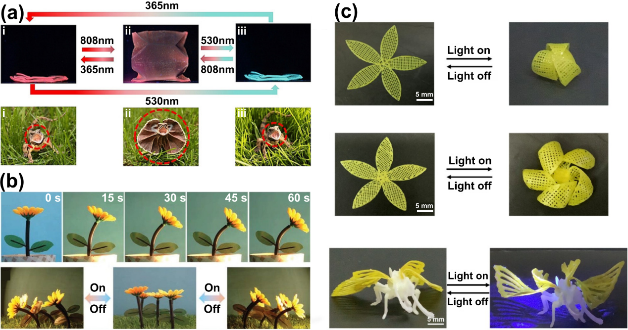 (c) 3D打印LCE的光响应仿生功能展示。